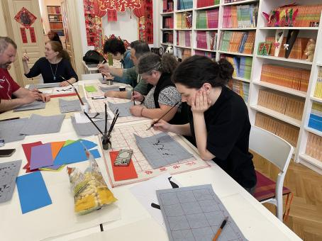 书法体验环节将活动主题进一步深化。志愿者教师从太极“道”的哲学思想切入,讲解汉字书写中虚实相生、动静相依的艺术特征,并现场示范书写“天人合一”。教师结合笔画结构,阐释其所蕴含的人与自然和谐共生理念。在实践环节,参与者纷纷提笔研墨,体验毛笔书写的提按顿挫。长桌之间气氛热烈,纸墨流转间,“天人合一”四字跃然纸上。许多嘉宾表示,通过书写汉字,不仅感受到中国书法之美,也对中国哲学思想有了更加直观的理解。这种将抽象理念转化为可感知实践的方式,使文化交流更具温度与深度。